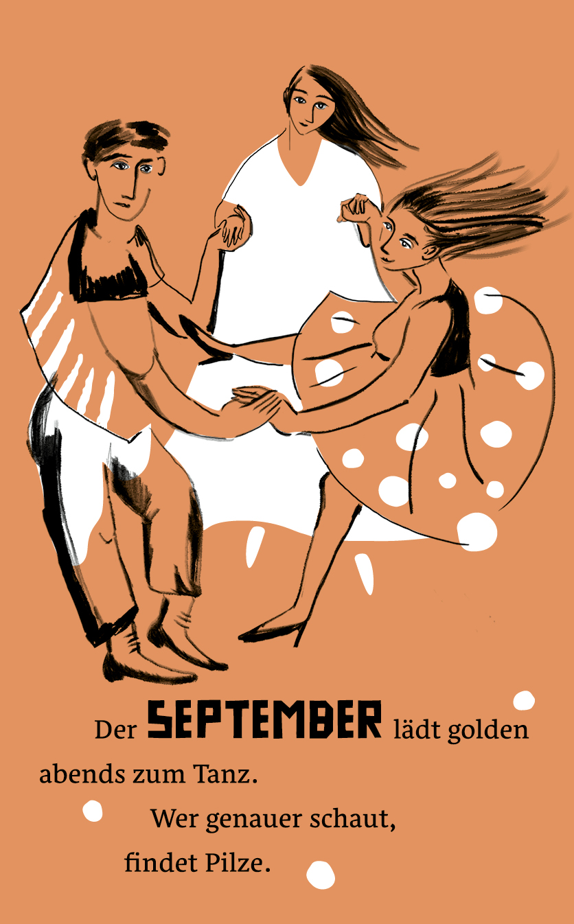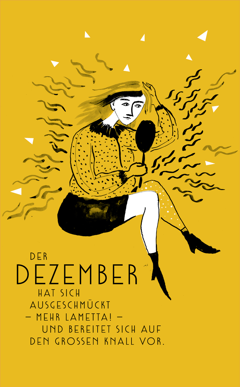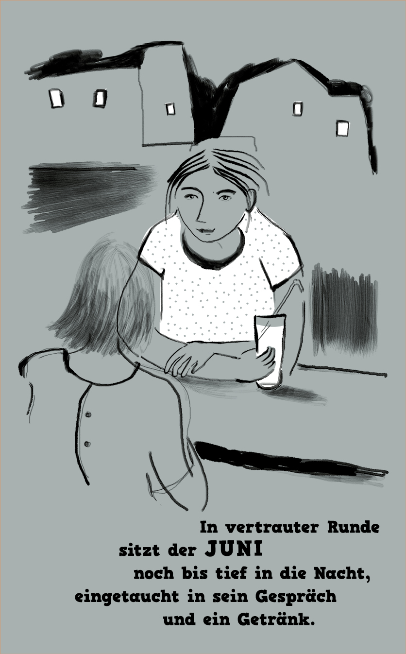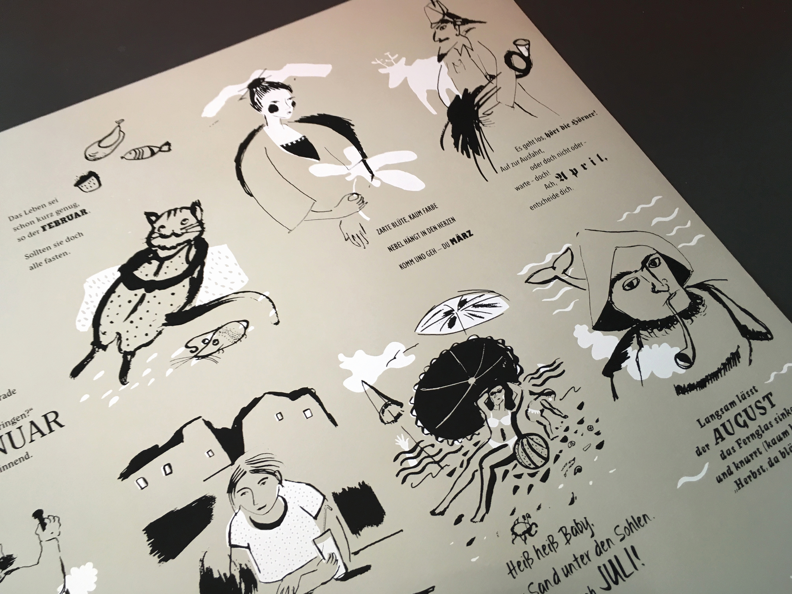 Die Zeichnungen sind konsequent in reduziertem Schwarz mit weißen Akzenten gehalten. Sie interpretieren die Texte, die spielerisch die Monate des Jahres umdichten. Oder interpretieren die Texte die Zeichnungen?
