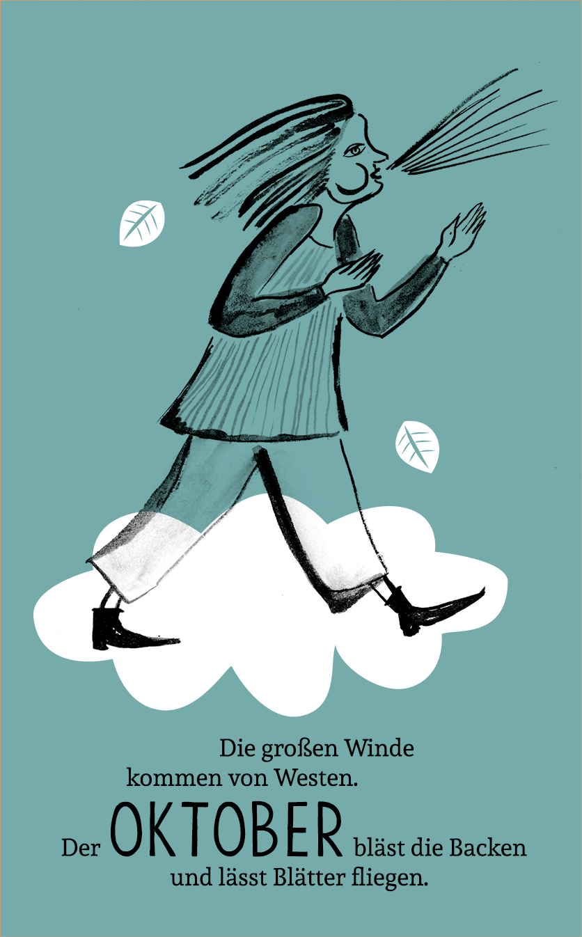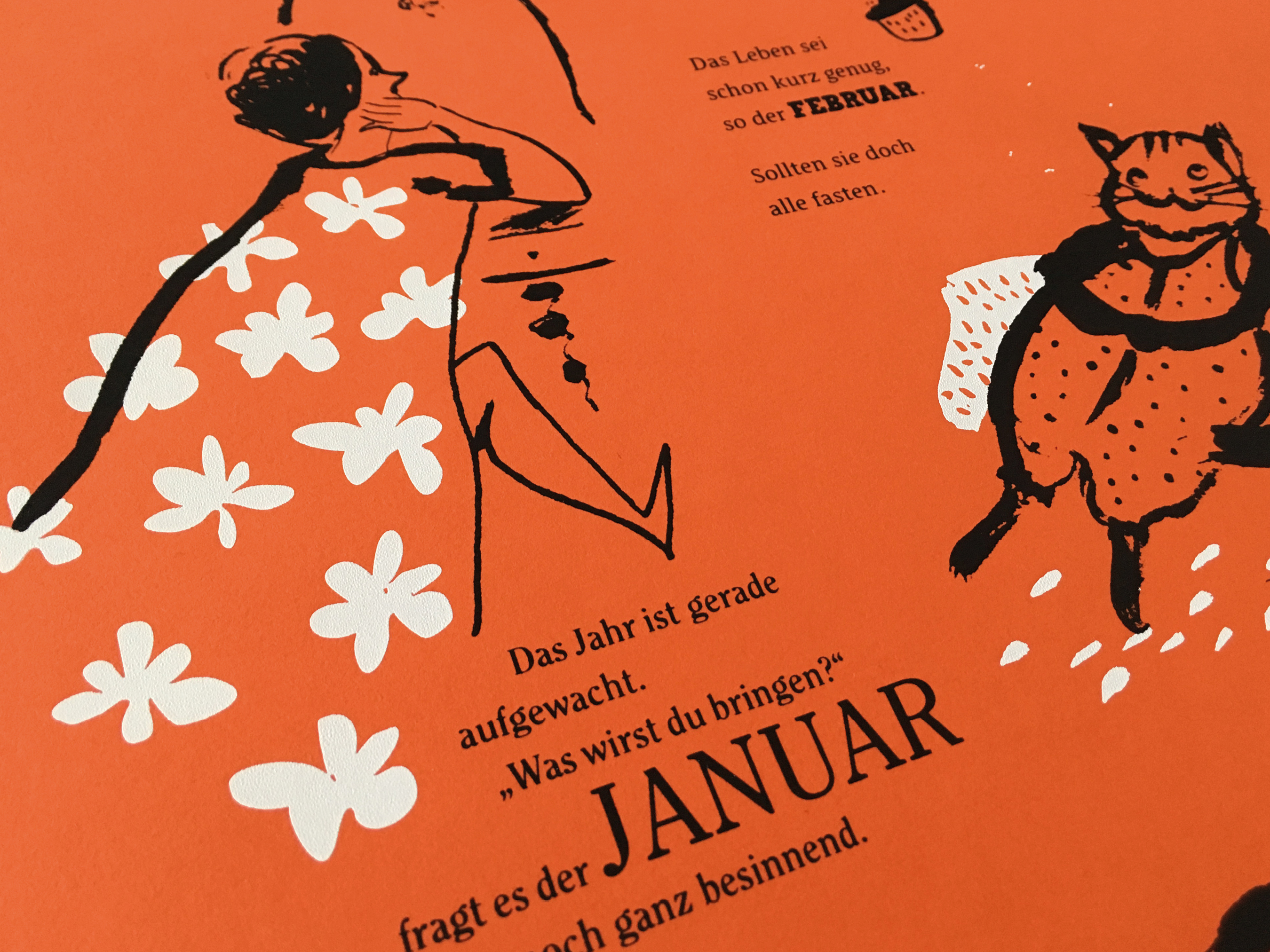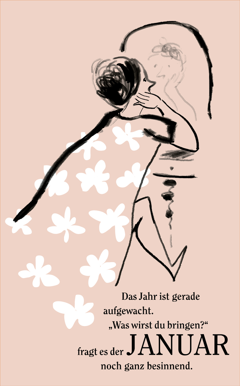 Die Zeichnungen sind konsequent in reduziertem Schwarz mit weißen Akzenten gehalten. Sie interpretieren die Texte, die spielerisch die Monate des Jahres umdichten. Oder interpretieren die Texte die Zeichnungen?